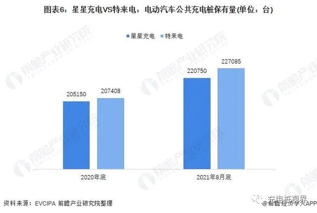 从电动汽车公共充电桩的保有量来看,2020年年底至2021年8月底,八个月期间,星星充电的电动汽车公共充电桩保有量由20.52万台增长至22.08万台,增长幅度为7.6%;特来电的电动汽车公共充电桩数量由20.74万台增长至22.71万台,增幅为9.49%。整体来看,特来电的电动汽车公共充电桩保有量多于星星充电,且增幅更大。