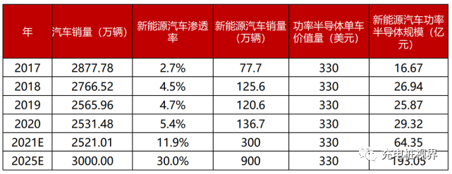 据GGII预测,2021年我国新能源汽车销量将达到300万辆,同比增长120%,根据中国汽车协会发布的《中国汽车市场中长期预测(2020-2035)》报告,预计2025年新能源汽车销量将达到900万辆。每辆新能源汽车中的功率半导体成本按330元计算,则可以估算出2025年我国新能源汽车领域功率半导体的市场规模将达到193亿元,未来5年的复合增长率将达到32%。