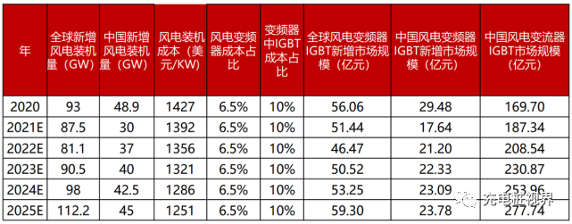 而风力发电中,需要运用到大量的IGBT、MOSFET、GTO等功率器件。预计2021至2025年,全球风电变频器件市场规模将增长261亿元,我国市场规模将增长108亿元。