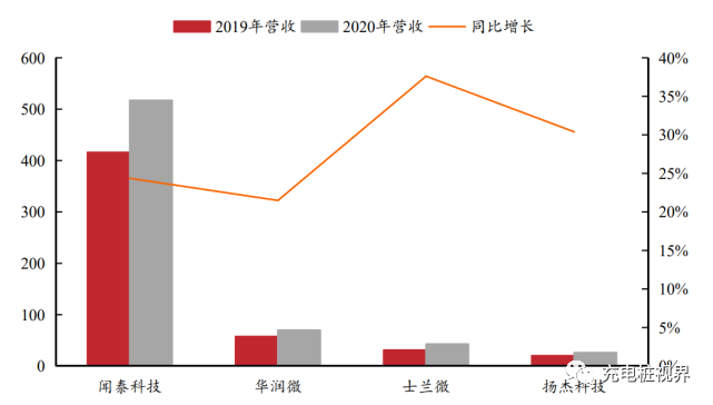但中国企业的增长势头则更为强劲,2020年中国排名前4的企业中,闻泰科技营业收入为517亿元,同比增长24.36%,华润微营业收入69.77元,同比增长21.5%,土兰微增长37.61%,扬杰科技增长30.39%,普遍远远超过了全球市场6%左右的复合增长率。