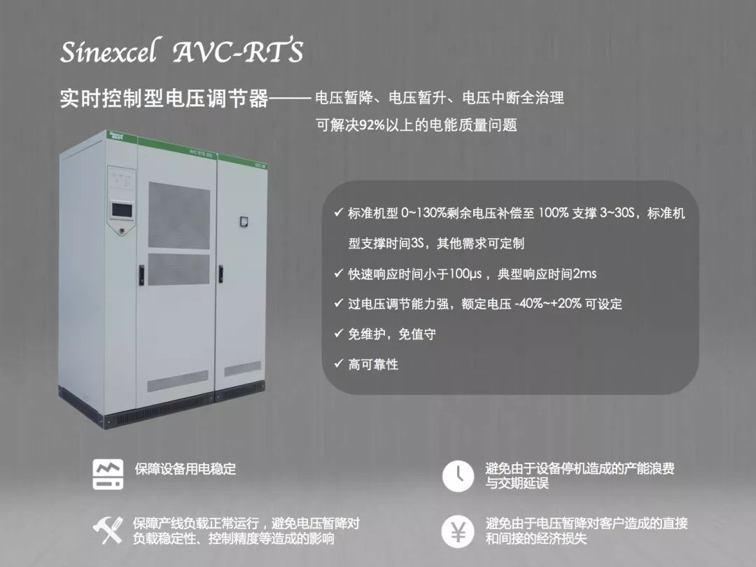 针对电压暂降现象,Sinexcel AVC-RTS产品,为众多受电压暂降困扰的企业解决了燃眉之急。它使用极其快速的电压矫正来去除工厂中的电压暂降、暂升,保障客户生产效益,为客户电力系统保驾护航!