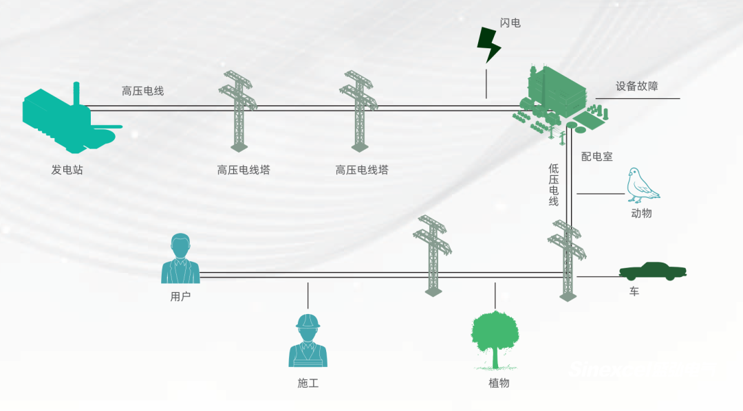 交通事故,建筑施工造成输电线路损坏,人为操作失误、小动物进入配电室等。