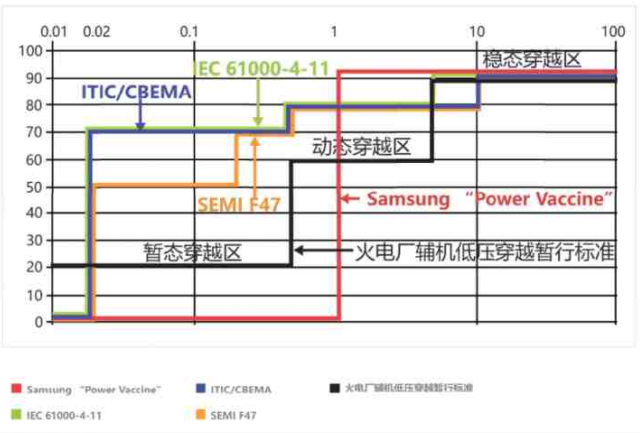 下图是各类标准对电气设备的免疫要求,从免疫曲线来看,一般设备对于短时间中度暂降以及长时间幅度较小的暂降事件具备很好的免疫力。但是不具备短时深度暂降免疫力,所以跌落幅度大的电压暂降事件是带来电压暂降危害的主要原因。