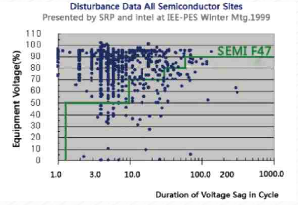 下图是美国电科院EPRI对电压暂降的调查情况,经过两次在全美洲22站点进行电能质量研究共记录到1076个电压暂降事件,其中在绿色线(SEMI)标准上方的电压暂降的数量占总数的93%仅有6个事件为断电,仅有3个事件在2秒以外。
