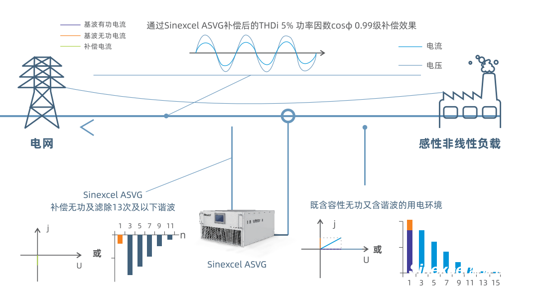 Sinexcel静止无功发生器SVG通过外部电流互感器(CT)实时检测负载电流,并通过内部DSP计算来分析负载的无功含量,然后根据设置值来控制PWM信号发生器发出控制信号给内部IGBT使逆变器产生满足要求的无功补偿电流,最终实现动态无功补偿的目的。