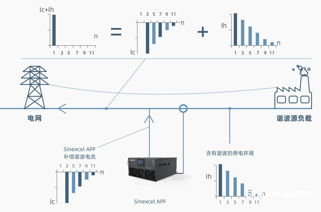 Sinexcel有源电力滤波器APF通过外部电流互感器CT实时检测负载电流,并通过内部DSP计算,提取出负载电流的谐波成分,然后通过PWM信号发送给内部IGBT控制逆变器产生一个和负载谐波大小相等、方向相反的电流注入到电网中补偿谐波电流,实现滤波功能。