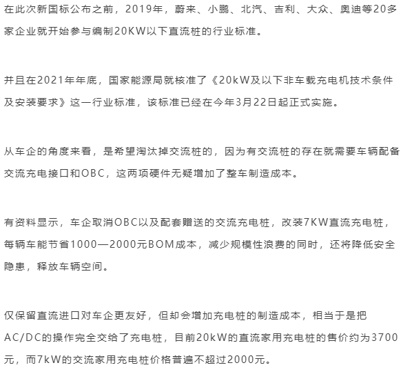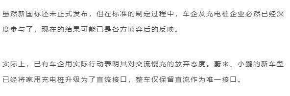 虽然大功率快充是一个趋势,但对于多数新能源车主而言,更多的时候还是会选择家用桩来充电,而此次新国标有让目前的交流桩变为直流桩的趋势。