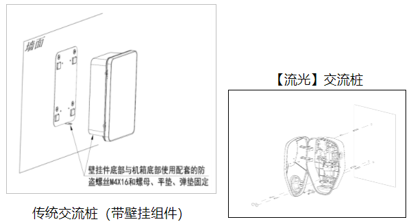 相较于传统充电桩,【流光】充电桩取消壁挂安装件以及底部冗余螺丝,仅3根螺丝就可稳稳固定上墙,更能方便用户快速安装与拆卸。