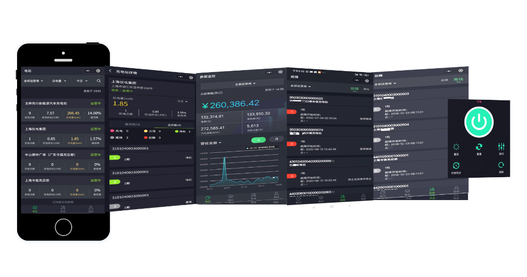 同时,后台PC云端+移动端H5小程序双重管理联手运行,汇集客户、充电、营收、系统、电站管理,营收数据,数据分析,实时监测八大功能,保障客户高效运营,轻松管理。