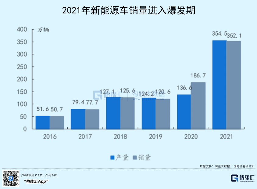 近年来我国新能源汽车市场由政策推动转向市场驱动,2016-2020年全国新能源汽车销量由 50.7万辆上升至186.7万辆,进入2021年后新能源汽车市场更是迈入了一个全新的台阶,销量达到352.1万辆,同比增长 88.59%。