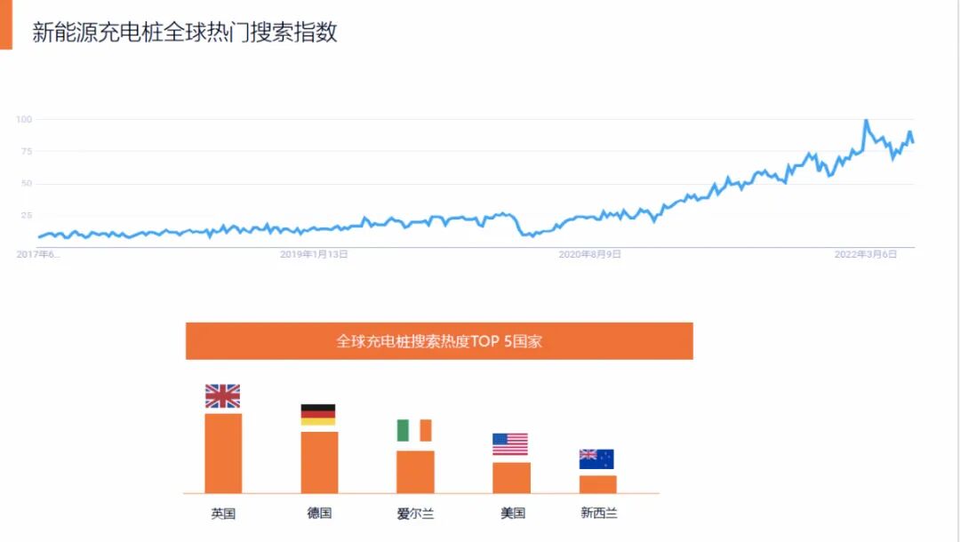 阿里巴巴国际站跨境指数显示,新能源充电桩全球热门搜索指数从2017年以来逐年攀升,尤其是2020年以来得到快速增长,目前对新能源充电桩搜索热度最高的国家为英国、德国、爱尔兰、美国和新西兰。