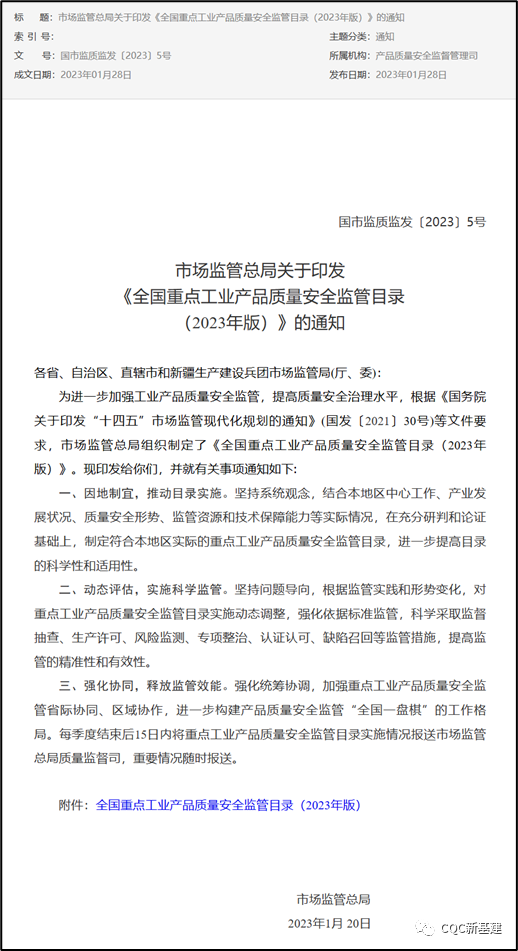 国家市场监督管理总局于2023年1月28日发布关于印发《全国重点工业产品质量安全监管目录(2023年版)》的通知,《目录》共包含14类247种工业产品。电动汽车充电桩(含电动汽车用充电延长线)纳入《目录》,其主产区包括但不限于江苏省(常州市武进区、苏州市吴中区),浙江省嘉兴市平湖区,山东省青岛市崂山区,广东省深圳市(南山区、宝安区、龙岗区、光明区)。通知提到将强化依据标准监管,科学采取监督抽查、生产许可、风险监测、专项整治、认证认可、缺陷召回等监管措施,提高监管的精准性和有效性。每季度结束后15日内将重点工业产品质量安全监管目录实施情况报送市场监管总局质量监督司,重要情况随时报送。