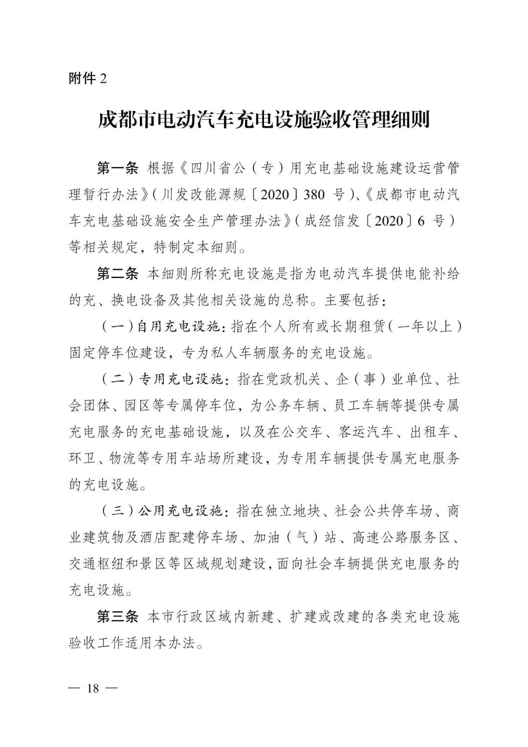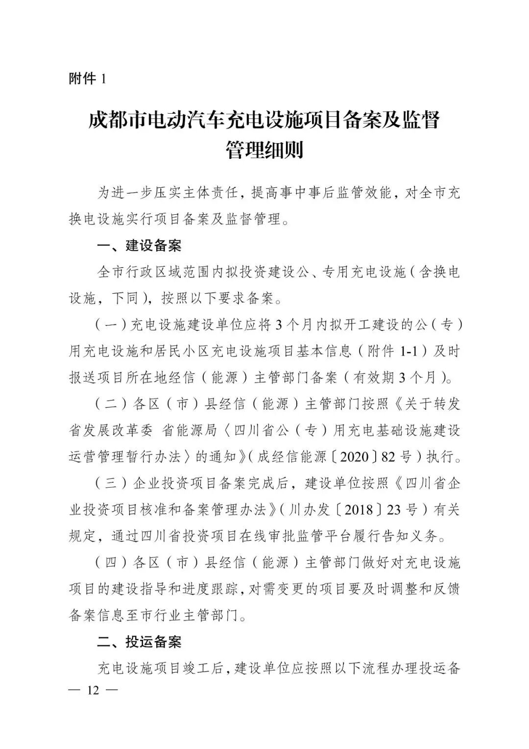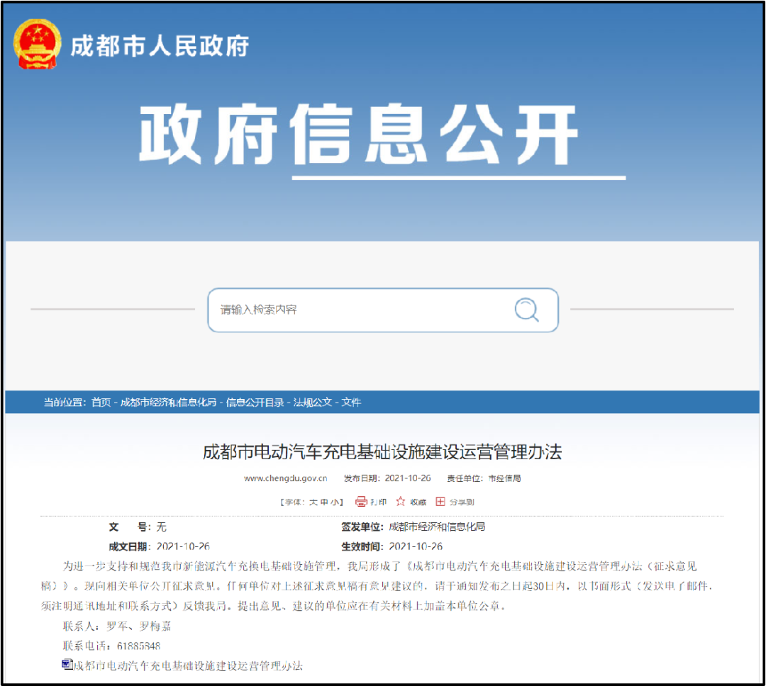 为规范全市充电设施的规划建设和运营管理,成都市经信局会同市发改委、市住建局、市应急局、市市场监管局研究制定了《成都市电动汽车充电设施建设运营管理办法》,自发布之日(2021年10月26日)起 30 日后施行,有效期至2025 年 12 月 31 日。