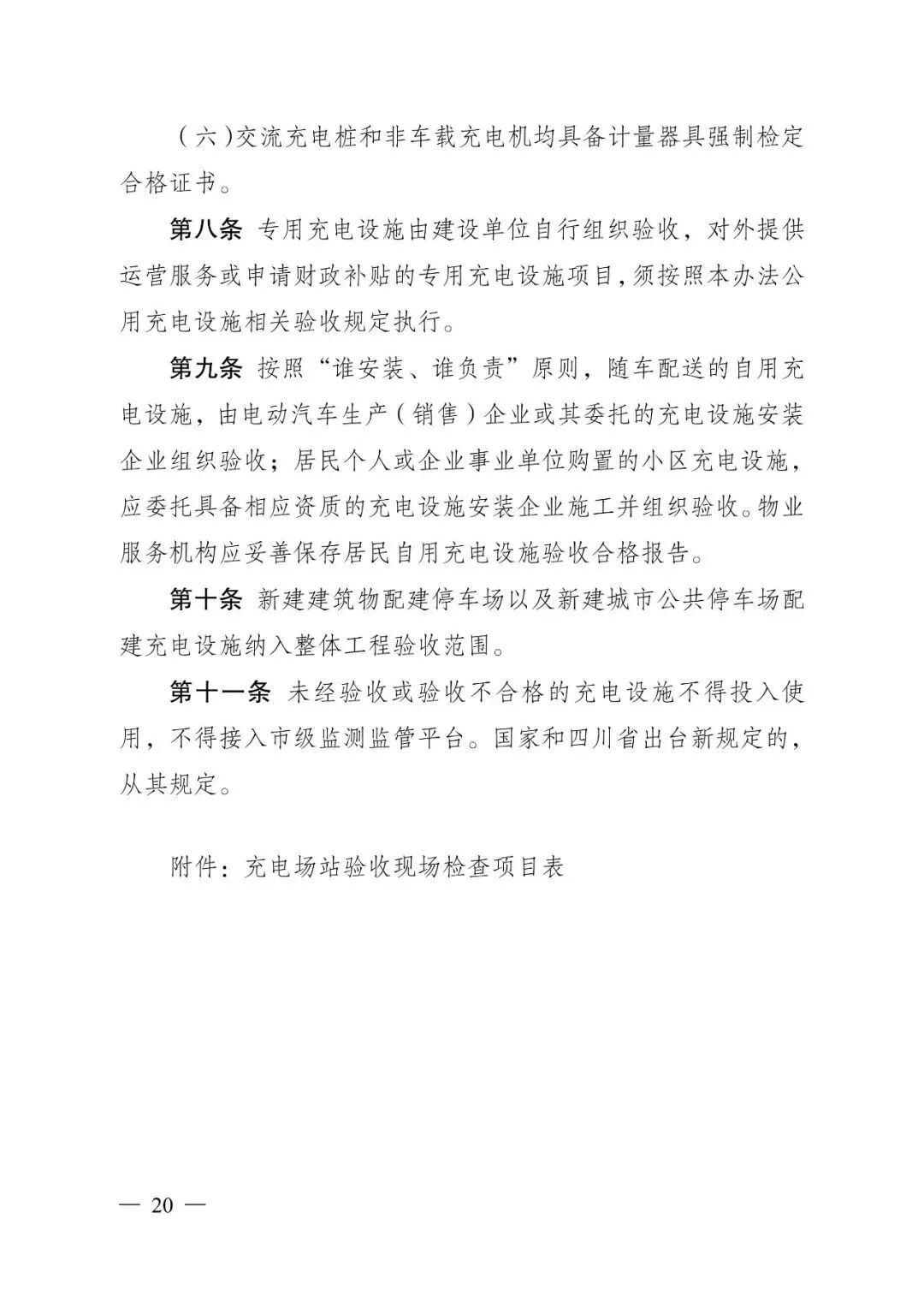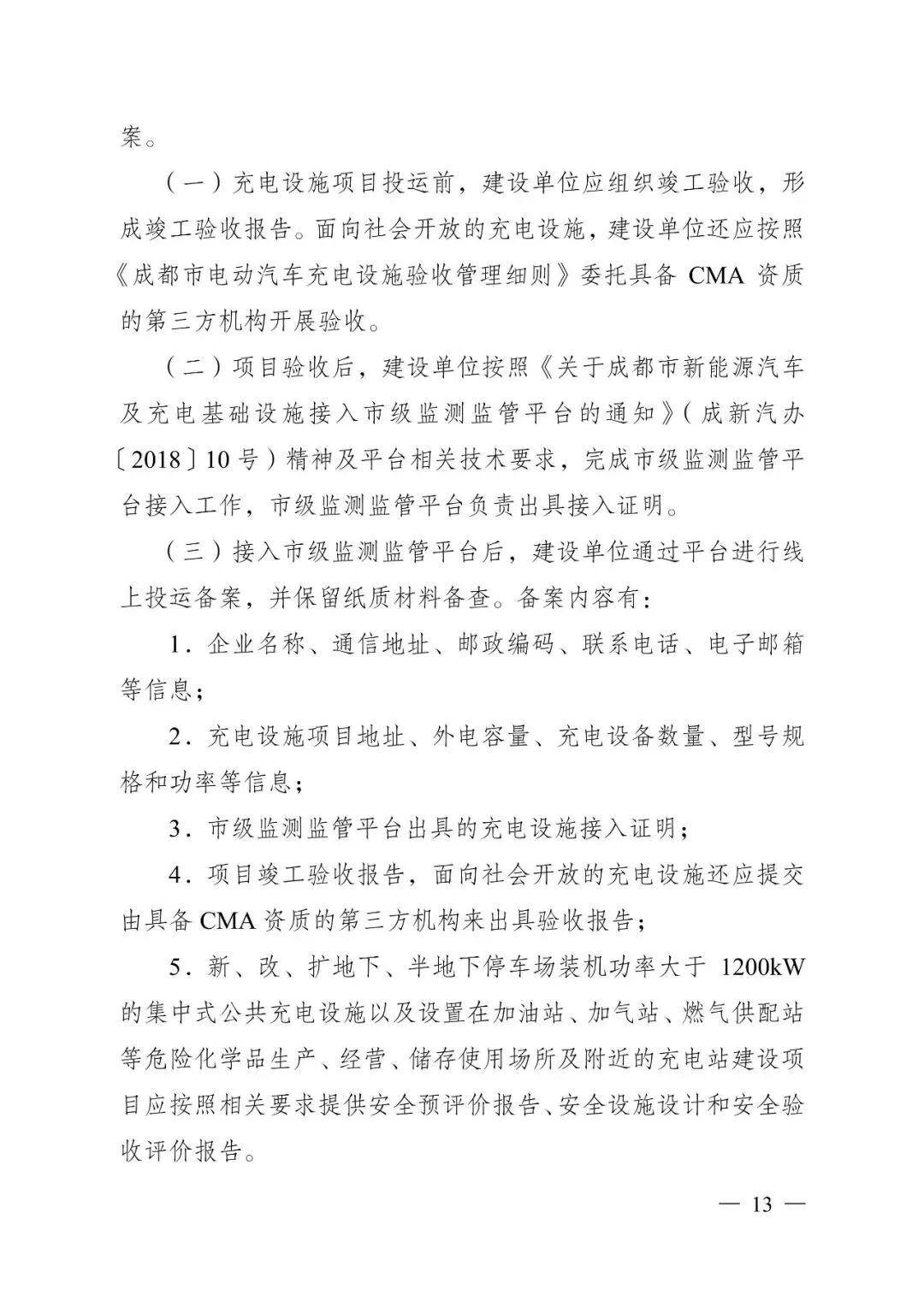 第十二条 充换电设施建成后,建设单位组织竣工验收并形成验收报告。面向社会开放的充换电设施,建设单位还应按照《成都市电动汽车充电设施验收管理细则》(附件 2)要求委托具备CMA 检测资质的第三方机构开展验收。未经验收或者验收不合格的充换电设施不得对外运营和申请各级财政补贴。