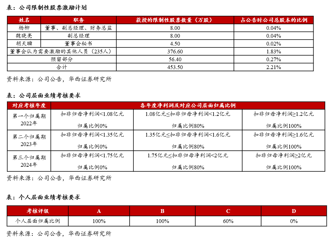 - 2022年3月25日,公司向高级管理人员等238名激励对象授予397.10万股限制性股票,授予价格为24.81元/股。公司层面的考核目标最低限度为,公司2022-2024年扣非归母净利润分别不低于1.08、1.35、1.75亿元即可获得80%归属比例,若分别不低于1.2、1.6、2.0亿元即可获得100%归属比例。