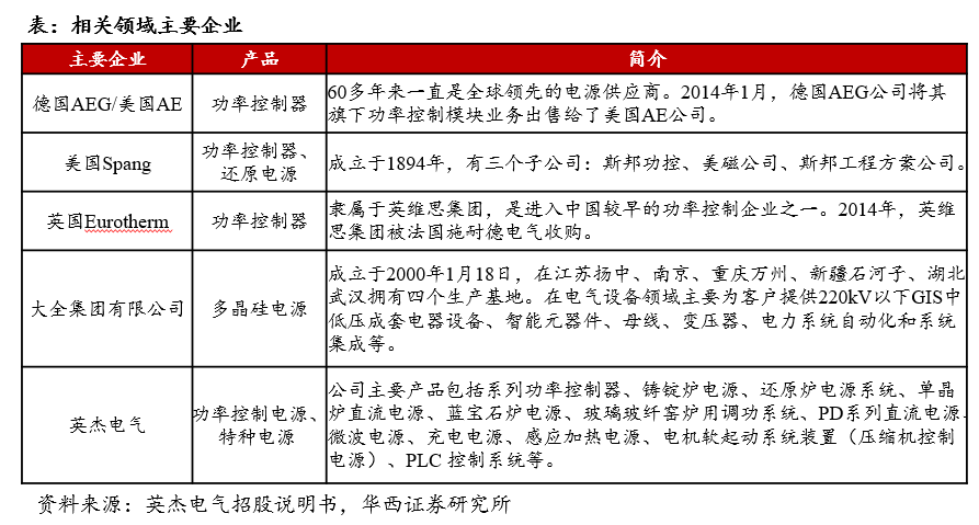 - 据公司22年5月10日公告,公司单晶炉加热电源已在行业多个大客户处样机验证通过,并进入小批量供货阶段。根据英杰电气招股说明书,单晶炉电源市场国产厂家数量较少,仅有英杰电气、盛弘股份等公司涉及,且均以电力电子技术为核心。公司凭借多年电力电子技术的深耕与品牌优势的积累,有望拓展单晶炉电源市场,为业绩带来增量。