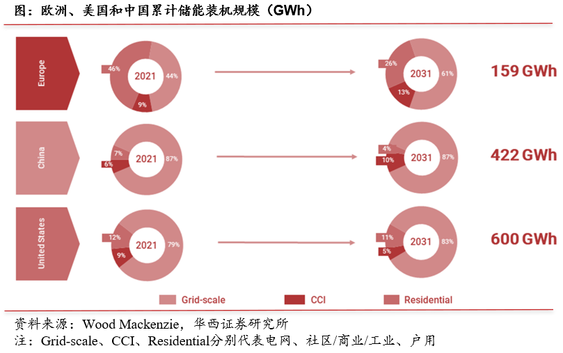2.3精准开拓中美欧市场,储能业务有望受益行业高增►中美欧引领储能市场,电网侧储能具备潜在发展空间。- 据CNESA数据,2021年,全球新增新型储能的投运规模首次突破10GW,达到2020年新增投运规模的2.2倍,保持高速增长态势。其中,美国、中国和欧洲引领全球储能市场的发展,三者合计新增新型储能规模占全球市场的80%。据Wood Mackenzie预测,2031年全球储能市场将达到累计500GW,美国和中国将占总量的75%。此外,电网级储能将占据中美市场较大份额,欧洲电网级储能比例提升明显。