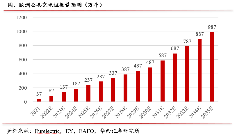 - 根据安永会计师事务所(EY)和欧洲电力行业联盟(Eurelectric)的联合报告估计,欧洲2030年电动汽车保有量将增长到6500万辆,而到2035年将达到1.3亿辆;到2035年,欧洲共需要安装5600万个家用充电桩和900万个公共充电桩来满足1.3亿辆电动汽车的补能需求,2022年至2035年的累计投资将达1150亿欧元。据EAFO数据,截止2021年,欧洲仅完成安装公共充电桩37.4万台,在电动车保有量大幅增长的情况下,欧洲充电桩市场未来成长空间广阔。