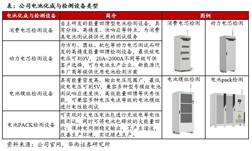- 公司电池化成与检测设备产品主要有锂电池系列、铅酸电池系列电池化成与检测设备,产品基本覆盖产线和实验室所有型号,满足电动两轮、乘用车、商用车、储能领域的设备要求。电芯类测试设备从5V6A到5V1000A;模组测试设备电压从60V到200V,电流从20A到1200A;PACK测试设备方面,随着2020年底针对储能领域1000V系列测试设备的发布,实现了电压从200V到1000V,电流从100A到1000A的覆盖。