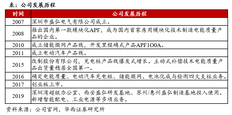 公司工业配套电源产品主要包括有源滤波器APF、静止无功发生器SVG、激光发生器电源、单晶硅炉加热电源等。公司是国内最早研发生产低压电能质量产品的企业之一。此外,公司激光器电源产品已向创鑫激光、武汉锐科等国内优质企业供货,单晶炉加热电源也已通过多个大客户样机验证,并进入小批量供货阶段。公司电池化成与检测设备产品主要涵盖锂电池和铅酸电池系列设备,产品基本覆盖产线和实验室所有型号,满足乘用车、储能等多领域要求。目前公司已为CATL、亿纬锂能、ATL、比亚迪、小鹏汽车等重要客户供货。- 公司是全球领先的能源互联网核心电力设备及解决方案提供商,致力于提供先进的电力电子技术。公司的前身盛弘电气有限公司成立于2007年,公司于2008年推出国内第一款模块化APF,成为国内首家房用模块化技术制造电能质量产品。此后,公司分别于2010和2011年先后成立储能微网产品线和电动汽车产品线,并于2016年确定电能质量、电动汽车充电桩、储能微网、电池化成与检测四大支柱业务。2017年,公司于创业板成功上市。