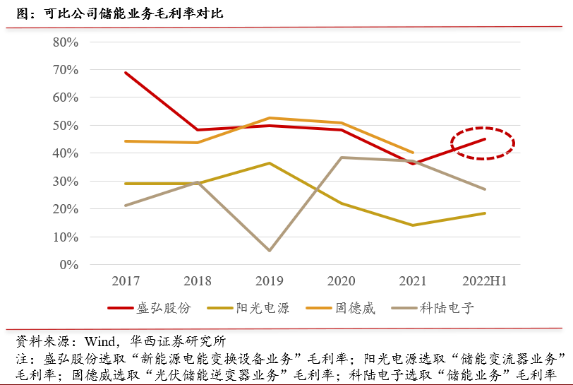 - 近年来,公司整体毛利率维持在40%以上。自2022年二季度以来,毛利率呈现边际改善态势。单二季度毛利率回升至43.71%,超越2021年整体水平,并在三季度继续攀升至44.62%,盈利能力持续向好。其中,公司2022上半年储能业务(新能源电能变换设备)毛利率回升至44.90%,较2021年全年大幅提升8.74pct,在同行业可比公司中保持前列。