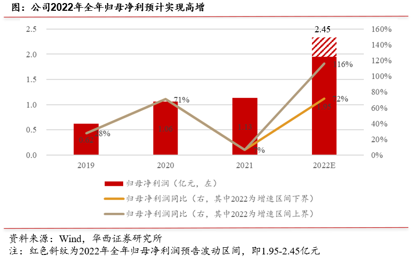 - 根据公司披露的2022年业绩预告显示,预计全年归母净利达1.95-2.45亿元,预计同比增长72%-116%;预计22年全年扣非归母净利达1.84-2.34亿元,预计同比增长83%-132%。各产品线收入同比增长,带动公司业绩同比高增。