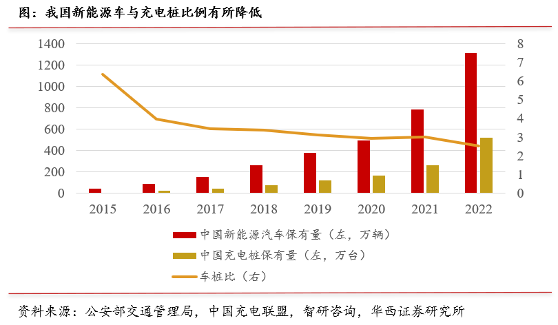 - 2021年,我国新能源汽车保有量784万辆,充电桩数量261.7万个,车桩比降至3:1。截止2022年末,车桩比继续下降至2.51:1,但和2015年《电动汽车充电基础设施发展指南》中提出到2020年建成480万个充电桩以满足500万辆新能源汽车充电,即车桩比基本达到1:1的目标仍有较大差距,未来电动汽车充电行业成长空间巨大。