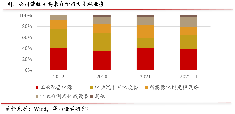 公司是全球领先的能源互联网核心电力设备及解决方案提供商。公司运用电力电子变换和控制作为核心技术,目前主要产品包括工业配套电源、新能源电能变换设备、电动汽车充电桩、电池化成与检测设备等。其中,公司新能源相关业务(电动汽车充电设备、新能源电能变换设备)与工业配套电源业务毛利占比近几年均维持在80%以上。预计公司未来将会聚焦充电桩和储能领域,新能源业务占比有望进一步提升。