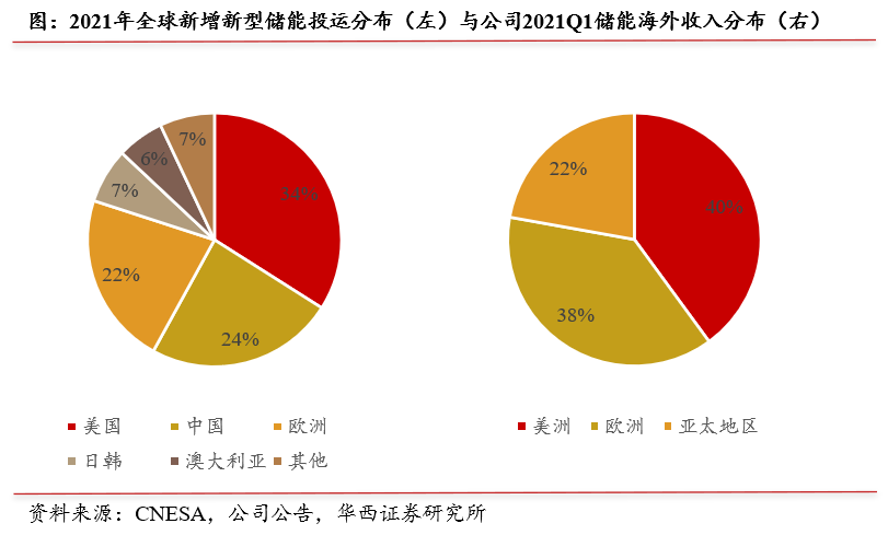 - 目前公司储能业务国内外均有布局。据公司披露,2020年与2021年一季度,公司欧美储能收入占储能海外收入接近8成。公司储能布局精准契合全球前三大新型储能市场,储能业务有望受益中美欧储能规模的高速发展。