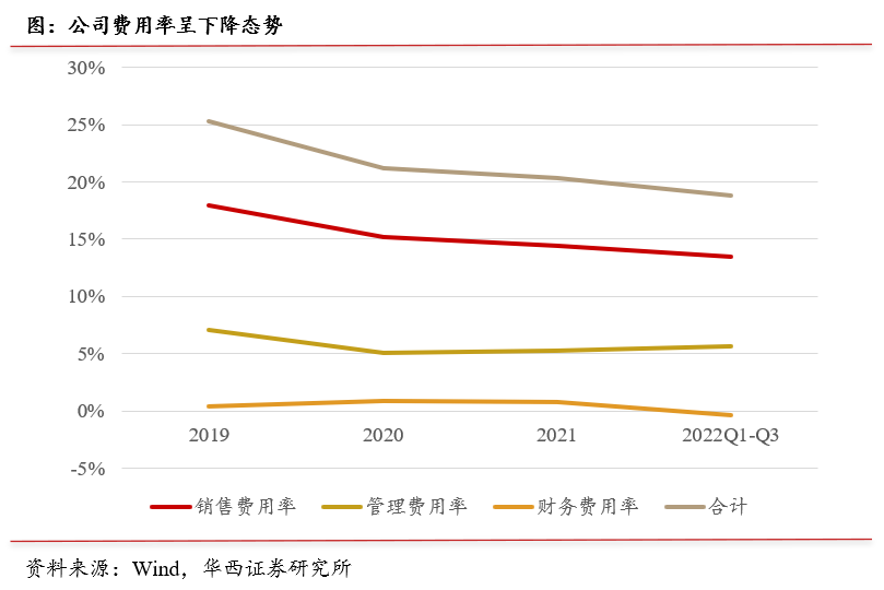- 近几年来,虽然公司规模在不断增加,但总体费用规模增长幅度不大,整体费用率呈下降态势。2022年前三季度,公司销售/管理/财务费用率分别为13.44%/5.68%/-0.34%,较2021年前三季度分别下降0.37/0.38/0.79pct,整体费用率管控能力较强。