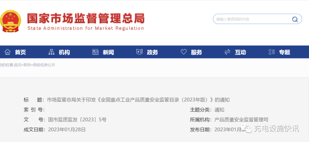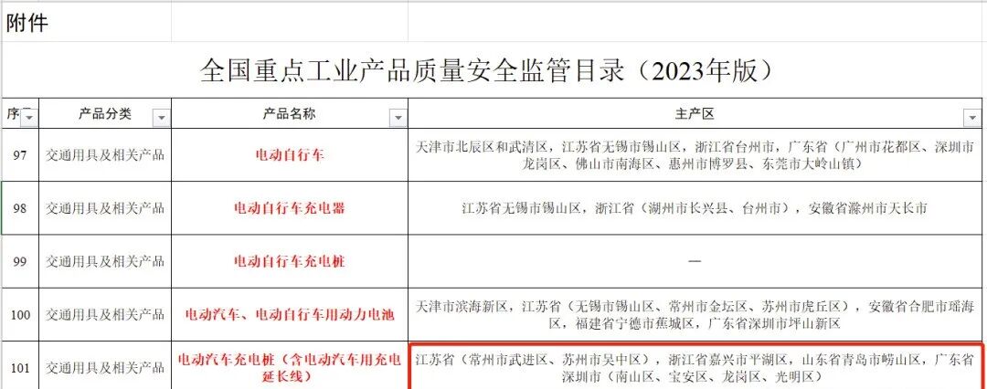 1月28日,国家市场监管总局发布《关于印发《全国重点工业产品质量安全监管目录(2023年版)》的通知》。《通知》将电动汽车充电桩(含电动汽车用充电延长线)列入重点质量安全监管目录,主产区包括但不限于江苏省(常州市武进区、苏州市吴中区),浙江省嘉兴市平湖区,山东省青岛市崂山区,广东省深圳市(南山区、宝安区、龙岗区、光明区)。